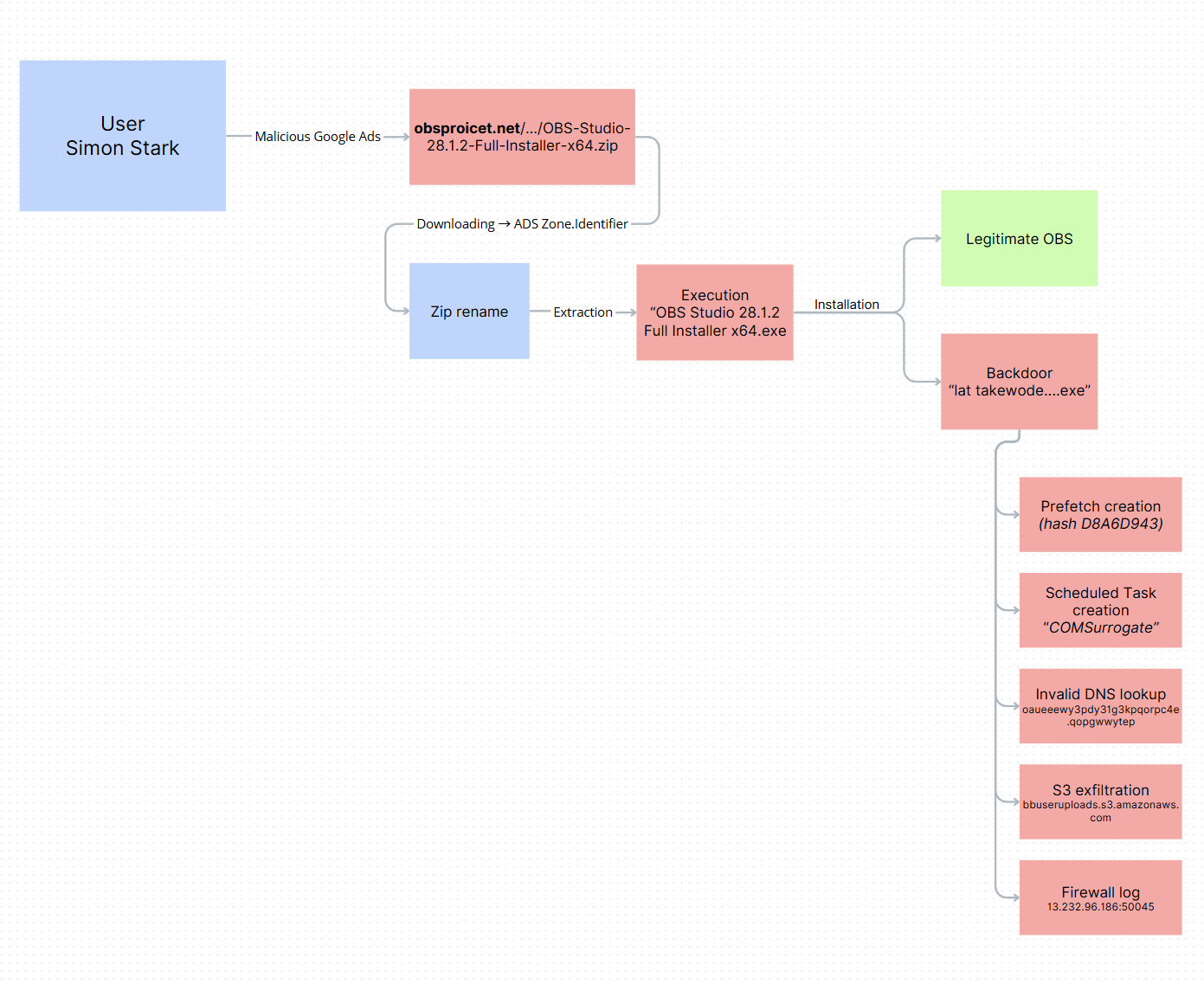 Simon Stark is a dev at forela who recently planned to stream some coding sessions with colleagues on which he received appreciation from CEO and other colleagues too. He unknowingly installed a well known streaming software which he found by google search and was one of the top URL being promoted by google ads. Unfortunately things took a wrong turn and a security incident took place. Analyze the triaged artifacts provided to find out what happened exactly.