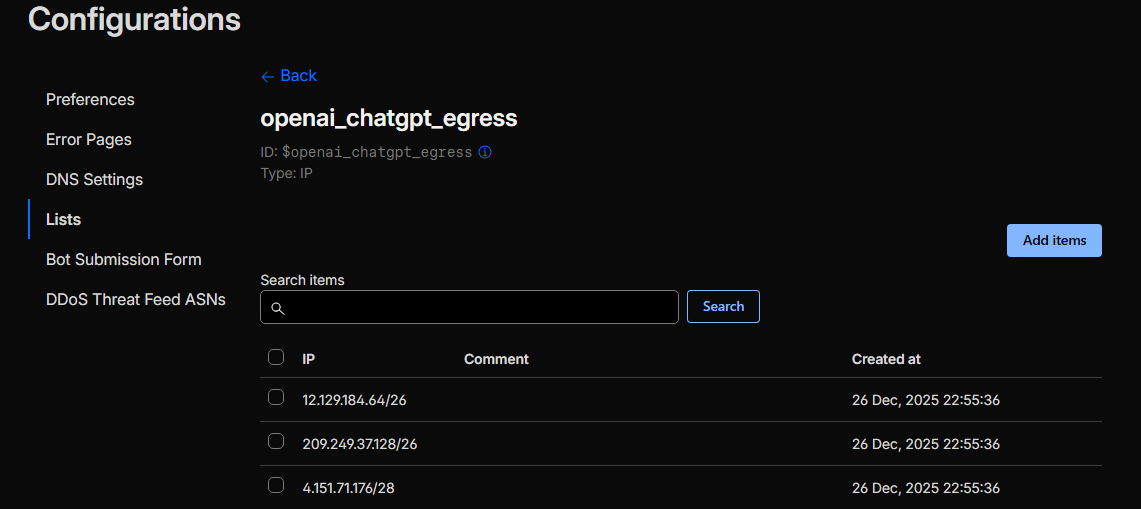 For this we’ll block everything BUT ChatGPT egress IP. In fact, OpenAI write in its documentation that it’s the only method for now: