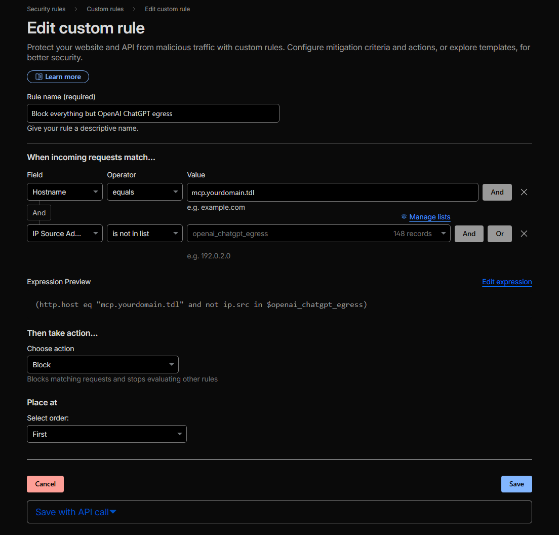 (http.host eq "mcp.yourdomain.tld" and not ip.src in $openai_chatgpt_egress)