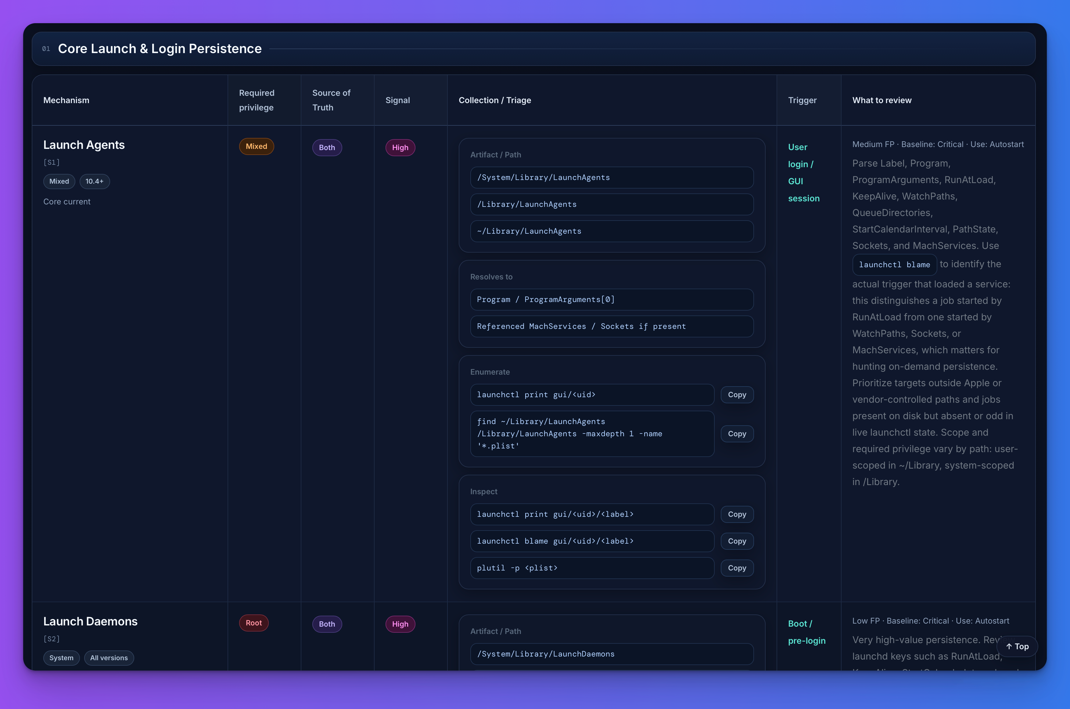 App preference triggersentry for persistence hidden in user preferences:Docktiles,Terminalcommand strings, andScreen Savermodules. - Added a