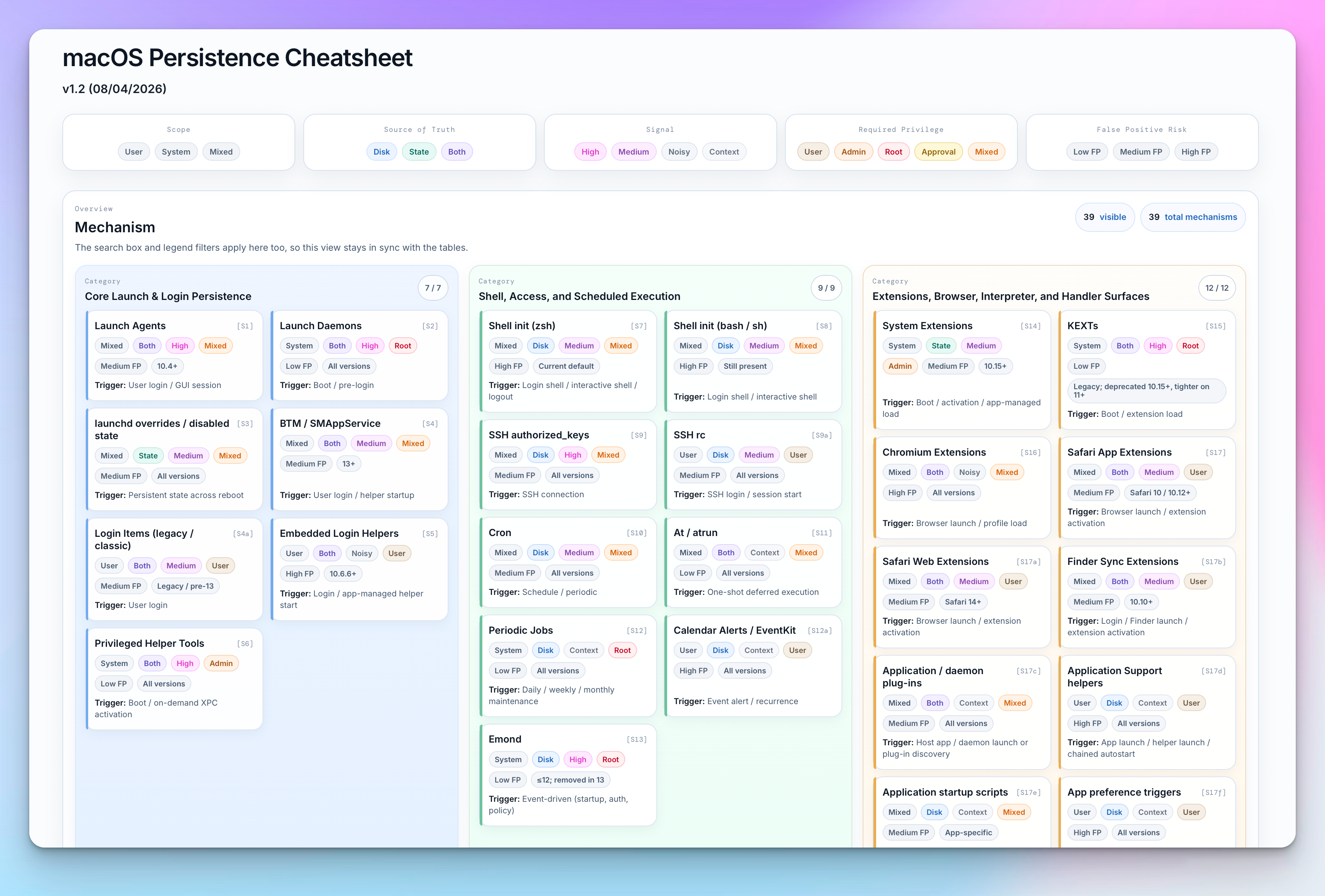- A practical DFIR-focused cheatsheet for identifying, triaging, and reviewing macOS persistence mechanisms. With additional context such as scope, required privilege, source of truth, signal level, false-positive risk and review guidance.