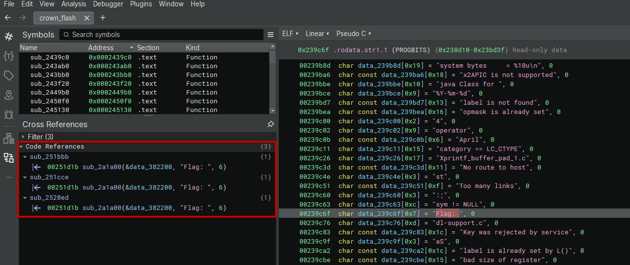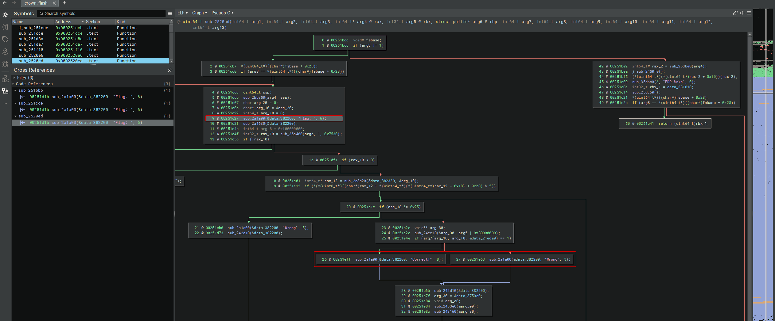 I’m trying to get more familiar with Binary Ninja so I used it for this challenge. The quickest anchor is the user-facing prompt string, so I searched for “Flag:” and followed its code references: