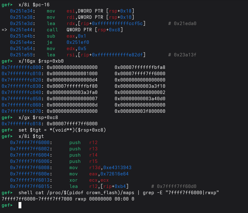 Sanity check: the indirect call target (*(void**)($rsp+0xc8)) falls inside the rwxp anonymous mapping, so we’re not guessing, we’re literally jumping into runtime-generated code.