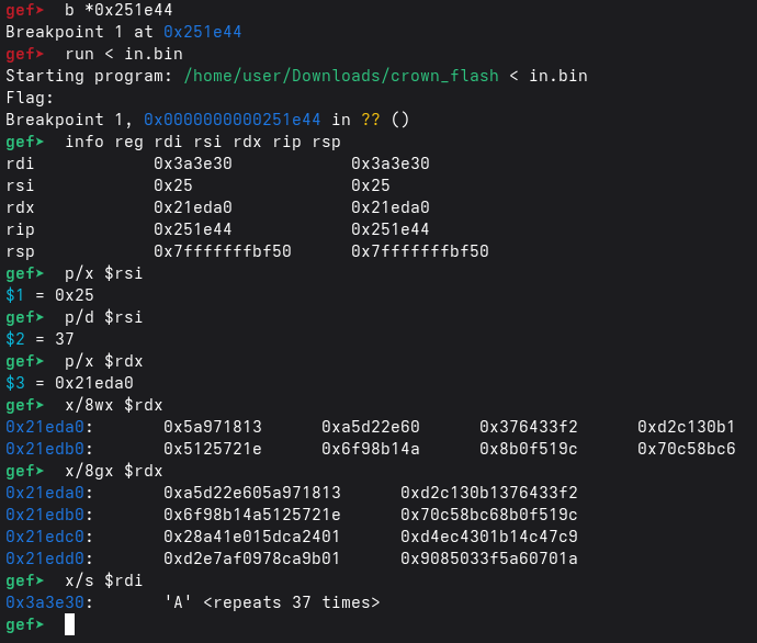 To find where the candidate flag is read we start by catching read and inspecting registers using the Linux x86_64 ABI: