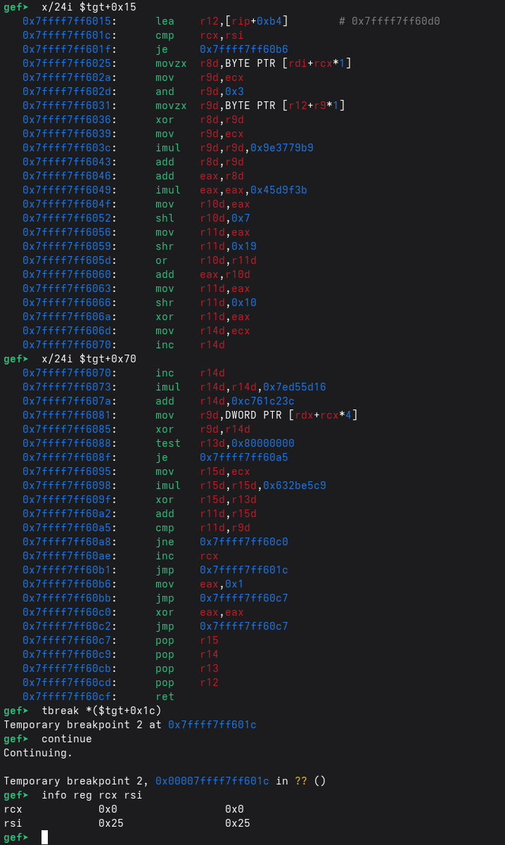 At the call site, the program performs call QWORD PTR [rsp+0xc8], i.e., the validator entrypoint is not a static symbol but a pointer stored on the stack. Dumping that slot (x/gx $rsp+0xc8) reveals the concrete jump target 0x7ffff7ff6000.